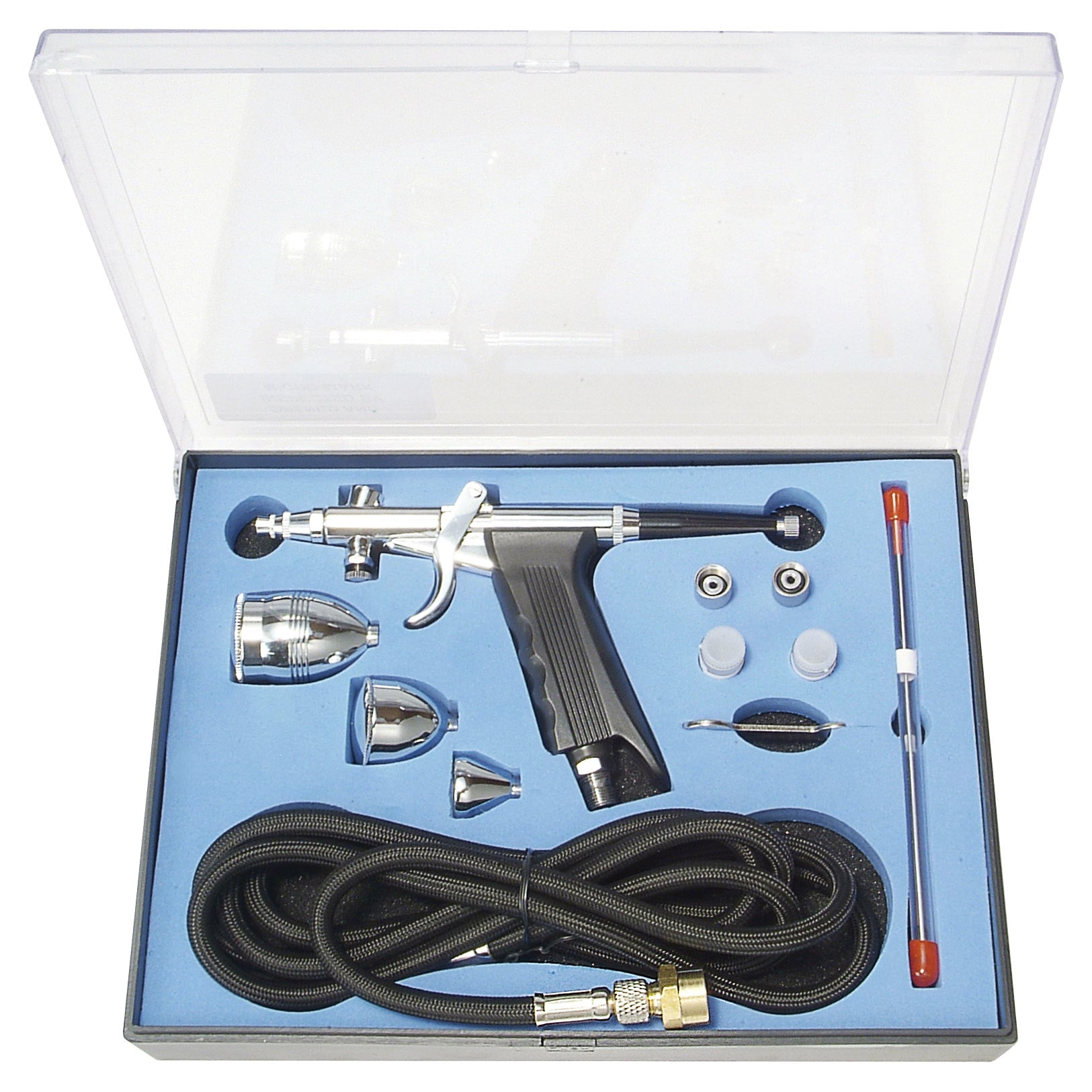 Pistol-grip single-action airbrush gun has the professional feel and features that model builders, hobbyists and artists need for projects of all types and sizes. Trigger action controls the amount of airflow through the airbrush; adjustable needle controls spray pattern. Gravity-fed, internal mix creates fine atomization of paint. Compatible with a wide variety of water and solvent-based paints, stains and washes. Set includes airbrush gun; 3 paint cups: 2 cc, 5 cc with lid, and 13 cc with lid; 2 extra tip assemblies; 3 needles (0.3, 0.5, and 0.8 mm); combination nozzle/hose connector wrench, deluxe 6 foot long braided hose; foam-fitted storage case; and instructions. Airbrush connection: 1/8 inch BSP male. Adapters included to change airbrush connection to M5x0.5 BSP male and 3/16 inch hose barb. Hose connections: 1/8 inch BSP female to 1/8 inch BSP female. Adapter: 1/8 inch BSP male to 1/4 inch BSP female (also fits 1/4 inch NPT male typical compressor outlet). MicroLux® brand. Features include: Pistol-grip handle and trigger for easy operation and comfort Single-action, internal mix airbrush for consistently fine atomization of paint Constructed of high-quality, precision components Sprays a wide variety of paints, stains and washes 0.3, 0.5, and 0.8 mm needles/nozzles 2 cc, 5 cc and 13 cc gravity-feed paint cups Built-in teflon O ring Spray pattern: hairline to 2 inches wide Working pressure: 15 - 50 psi