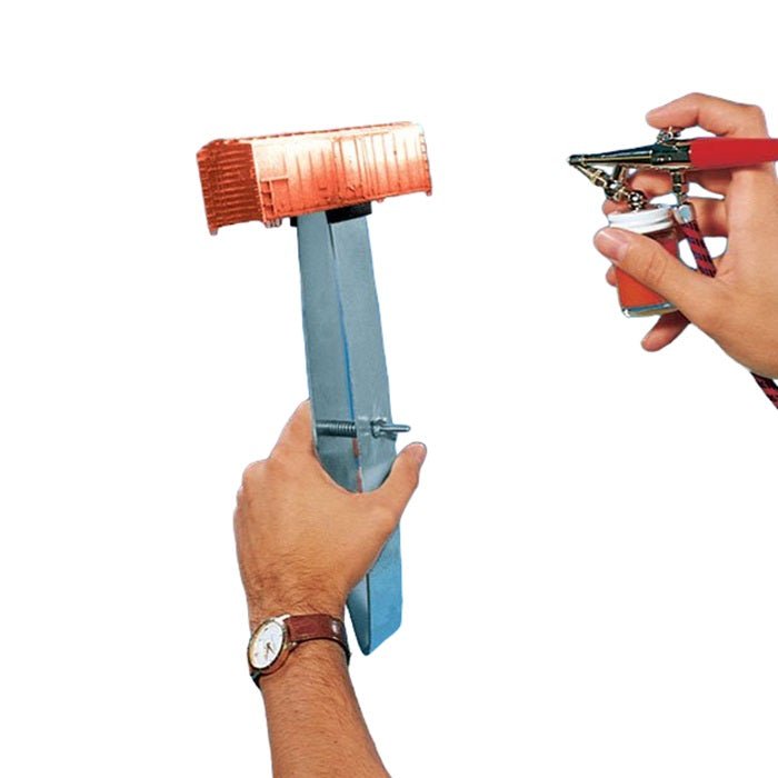 Adjustable spring tension holds models gently yet securely without distortion. The soft, no-slip jaw pads grip from the inside so you can paint the entire model by rotating the handle. When you're done painting, just rest the handle on the edge of your workbench or hang from an overhead hook until the paint dries. 12 inch long handle keeps your hands away from overspray when airbrushing. Adjusts to hold models with inside dimensions from 1/2 inch to 5 inches. Made of aluminum and steel with neoprene rubber jaw pads.