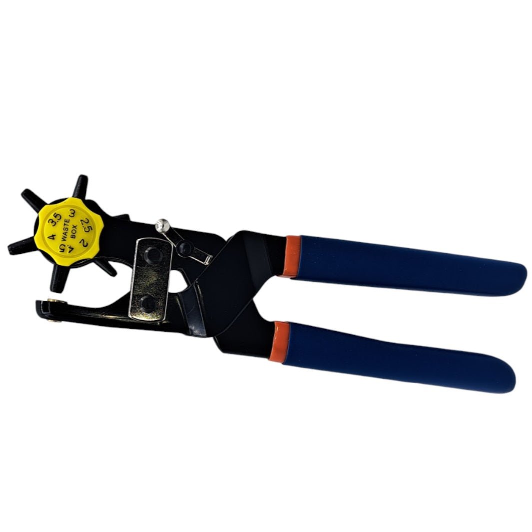Revolving turret-head punch cuts easily through leather, plastic, canvas, cardboard...even thin wood veneers. Cuts hole sizes 5/64 inch, 3/32 inch, 7/64 inch, 1/8 inch, 5/32 inch and 3/16 inch. Blackened steel with tempered steel punches, brass anvil and vinyl grips.