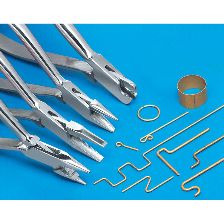 Our set will make loops, rings, S, C, Z, L and just about any other shape. Set bends strip stock up to 1/32 inch thick and wire up to 3/32 inch. The strange looking plier at the top of the photo will even bend hardened music wire. Made of polished stainless steel with box joints that keep jaws in alignment. Orthodontists use these and pay about $20.5 each from dental supply houses. We buy directly from the manufacturer. The result is a set of incredibly useful, well-made tools at a great price.