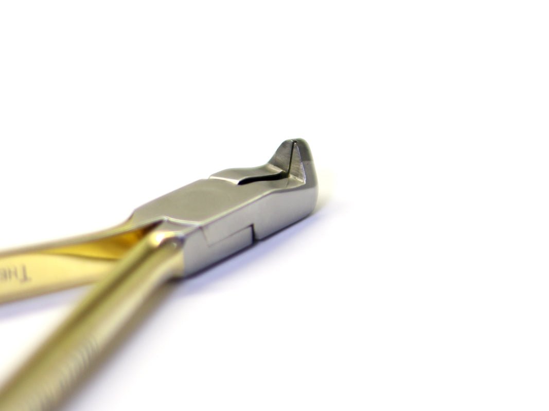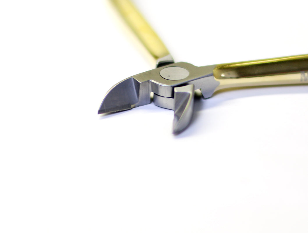 Designed for orthodontal use, these slim precision pincers are right at home working in any confined space; plus, their carbide cutting inserts leave a smooth, burr-free edge on both hard and soft wire. Made of high carbon 420 Japanese surgical stainless steel with gold electro-polished handle ends, these powerful cutters will even slice through piano wire up to .026" with ease.