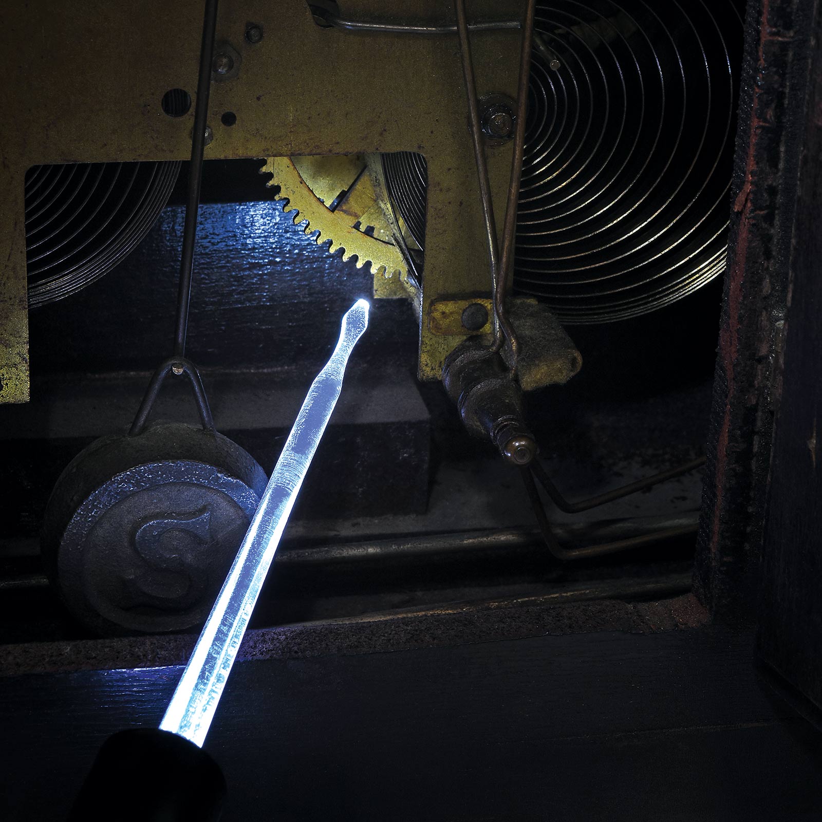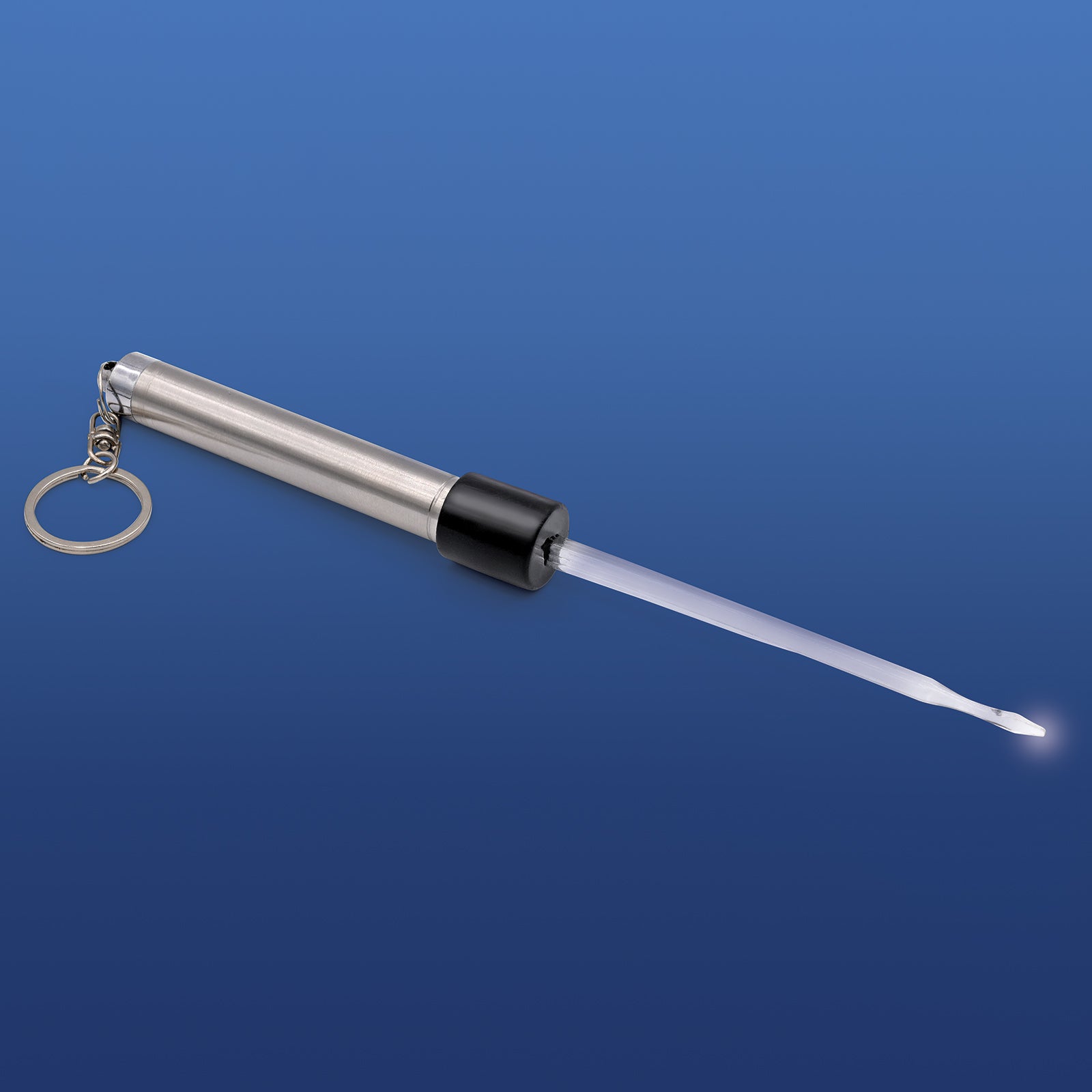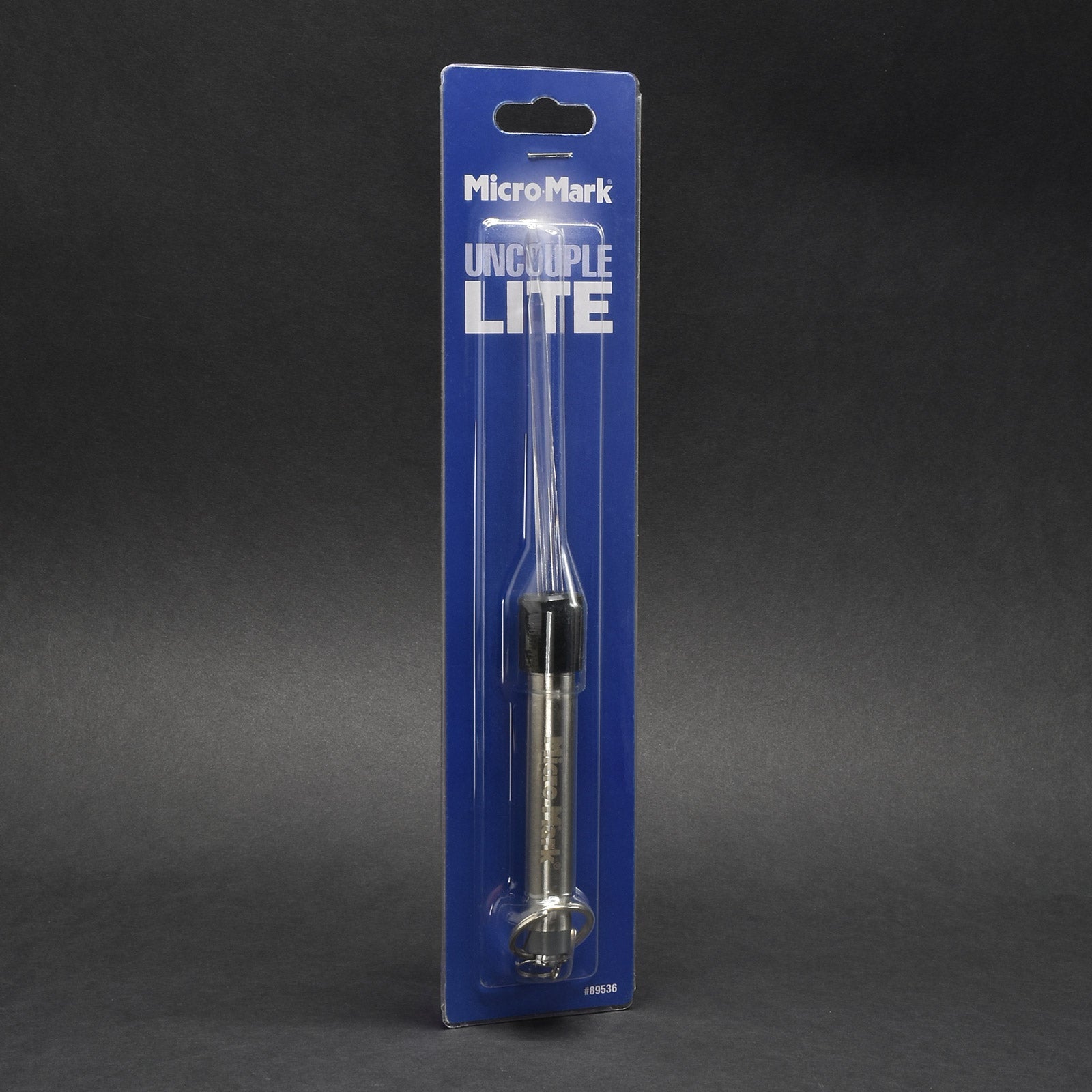 With a lighted tip length of 4" and less than 1/4" diameter at its thickest, UncoupleLITE is also extremely useful as a precision pinpoint flashlight, providing focused, non-glare illumination inside machinery and confined areas where no other light can go. Includes 4" x 1/2" stainless steel body with push-button on/off switch, removable 4" x 1/4" acrylic light rod, and key ring. Requires one AAA battery, not included.