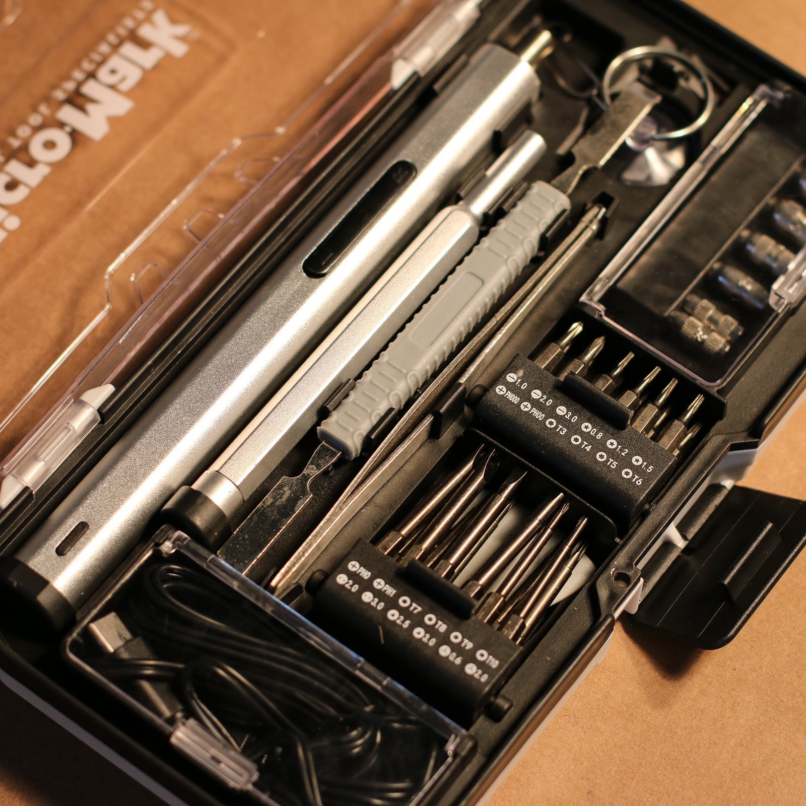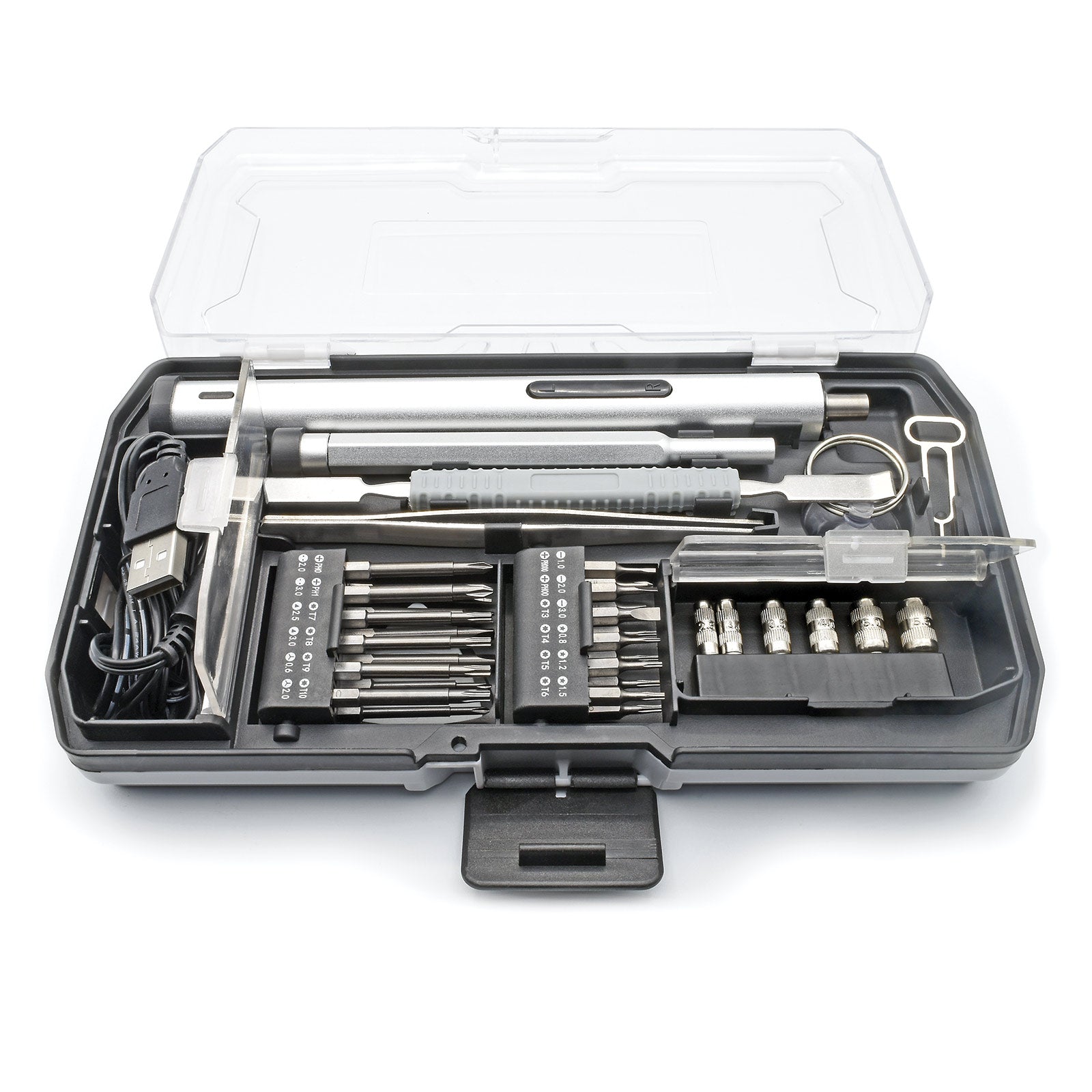 This unique 4V rated DC lithium-powered Ultra-Slim Driver Set is ideal for technicians and hobbyists. At just 2.5 oz, this feather-light, yet powerful driver is comfortable in your hand and a workhorse on the bench or on-the-go. Features include an in-line forward and reverse switch and 3 bright LED lights that illuminate your work. Internal battery is USB rechargeable and is back to full power in only 50 minutes; LED indicator shows when charge is complete. Ultra-Slim driver body is only 5/8" in diameter with two built-in flats to prevent tool from rolling; 7" long overall. Provides .25 Newtons / .185 ft. lbs. of torque. 4 mm drive. Set includes: Ultra-Slim 4V Power Driver; 6 nut driver sockets: 2.5 mm, 3 mm, 3.5 mm, 4 mm, 5 mm, 5.5 mm; 12 M4*45 mm bits: Phillips #0, #1; Torx 7, 8, 9, 10; spanner/snake eyes: 2.0, 3.0; triangle: 2.5, 3.0; tri-wing: 0.6, 2.0; 12 M4*28 mm bits: slotted #1, #2, #3; 5-node: #4, #5, #6; Phillips: #000, #00; Torx 3, 4, 5, 6; Tweezer; Mini pry bar; Manual screwdriver; iPhone sim card removal tool; USB / USB-C cable; Plastic case.