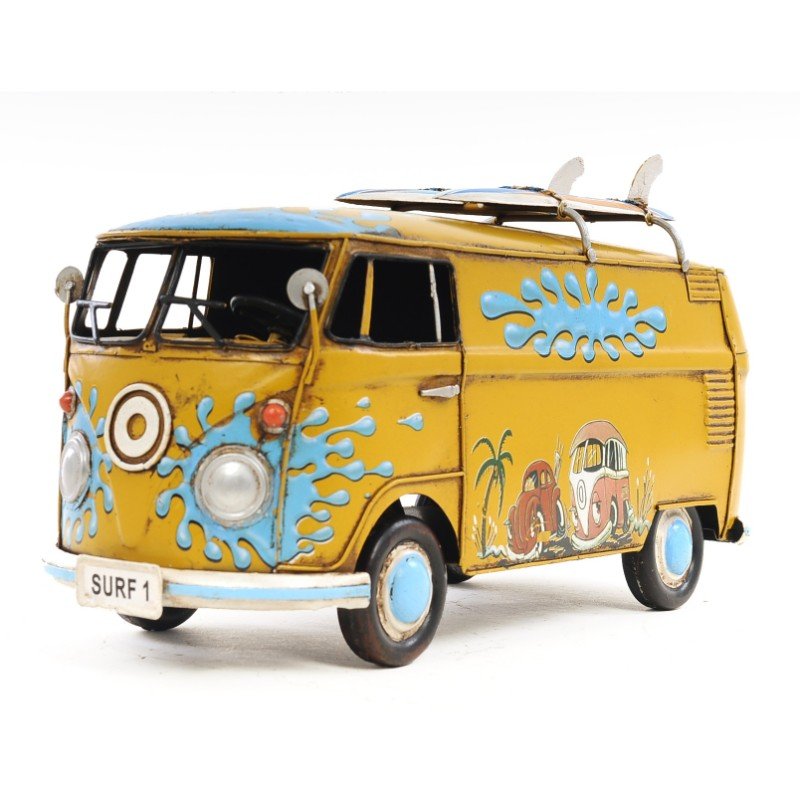 Completely handcrafted and pre-built in iron, and painted in a vintage style, this collectible model features a nostalgic '60s paint scheme with "Surf 1" license plate and two surfboards on roof rack. The metal wheels will roll, and the surfboards are securely welded to the model. Makes a great gift, or a handsome decorative piece for the home or office.