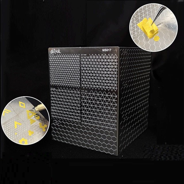 Part of the new MSWZ line of metal etched tools, perfect for modelers and crafters, we tracked down these hard-to-find precision cutting guides because we need them, too! Until you try one, you just won't believe how smooth, clean and sharp the cuts you make can be using an ordinary hobby knife and a fresh blade. Delicate metal-etched grooves in the stainless steel surface are almost too fine to feel with your finger, yet provide surgically accurate cuts with almost zero effort. Made of Stainless Steel. Take it from us, you need these!