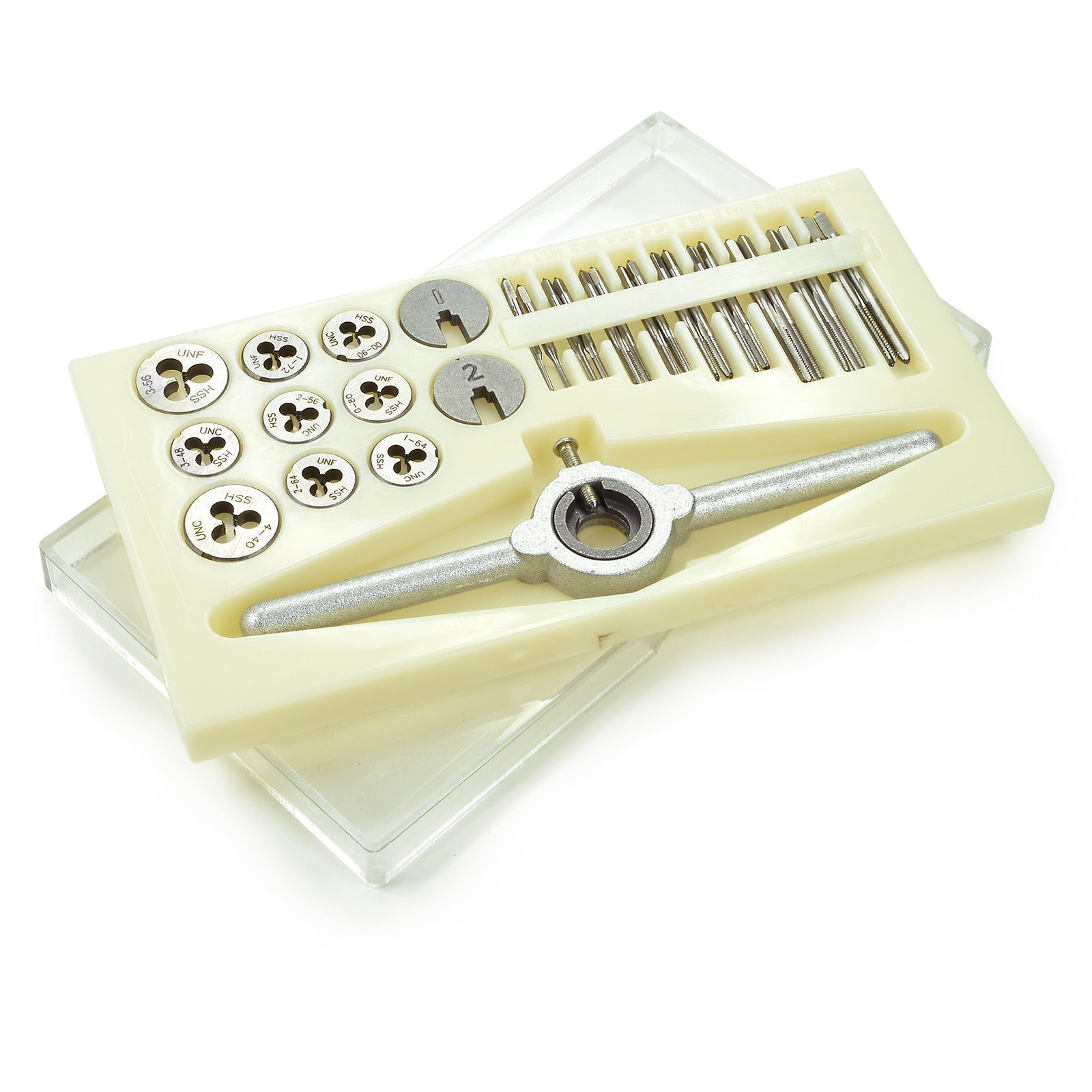 A super miniature complete high speed steel SAE (Standard) taps and dies set for jeweler’s, watchmaker’s, electronics repairmen and craftsmen. This is the finest set that we have seen of super miniature sizes in one set. It contains a combination die stock / tap handle, A selection of UNC and UNF non-split dies that includes: (7) 15/32” dia. Dies: 00-90, 0-80, 1-64, 1-72, 2-56, 2-64 and 3-48. Two 5/8” dia. Dies: 3-56 and 4-40. You are double loaded with taper taps that matches the dies listed. 18 taps in all! And one of each tap insert #1 and #2 to mount the taps into the handle. Beautifully crafted in a molded case with clear lid.