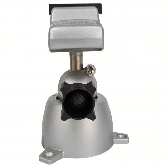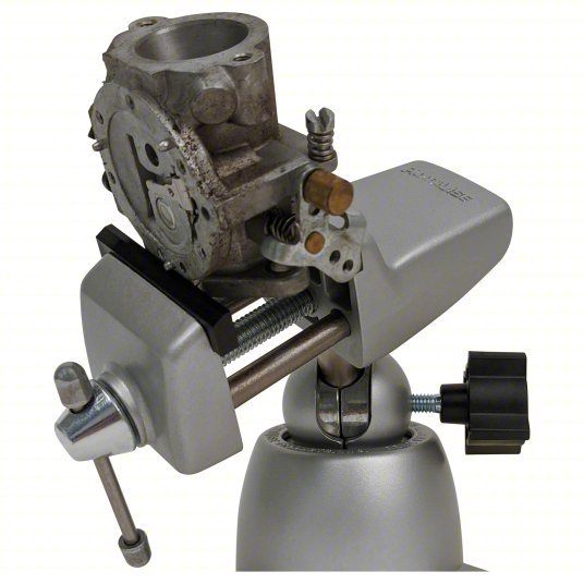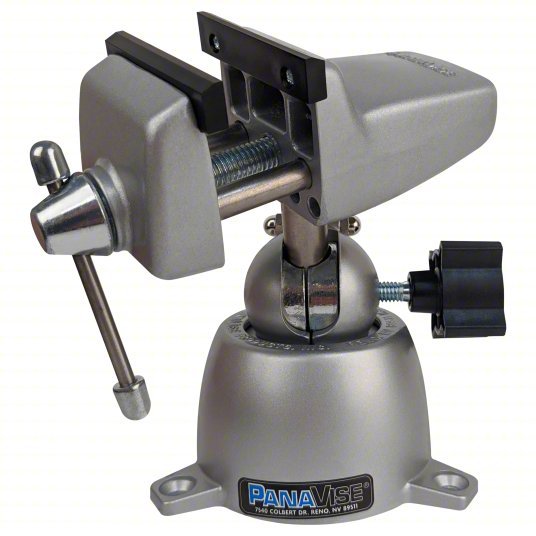 Hold it anywhere you want it! This professional quality vise will undoubtedly be the most used and useful tool on your workbench. Panavise tilts, turns and rotates to any angle or position with one turn of the control knob. The vise head and base are pressure-cast aluminum alloy with steel and brass inserts. Jaws are 2-1/2 inches wide, replaceable satin finish nylon for increased grip and gentle strength. Jaw opens to 2-1/4 inches, closes to zero. The variable load control knob and exclusive split ball feature permits moving work to any position. Made in USA.